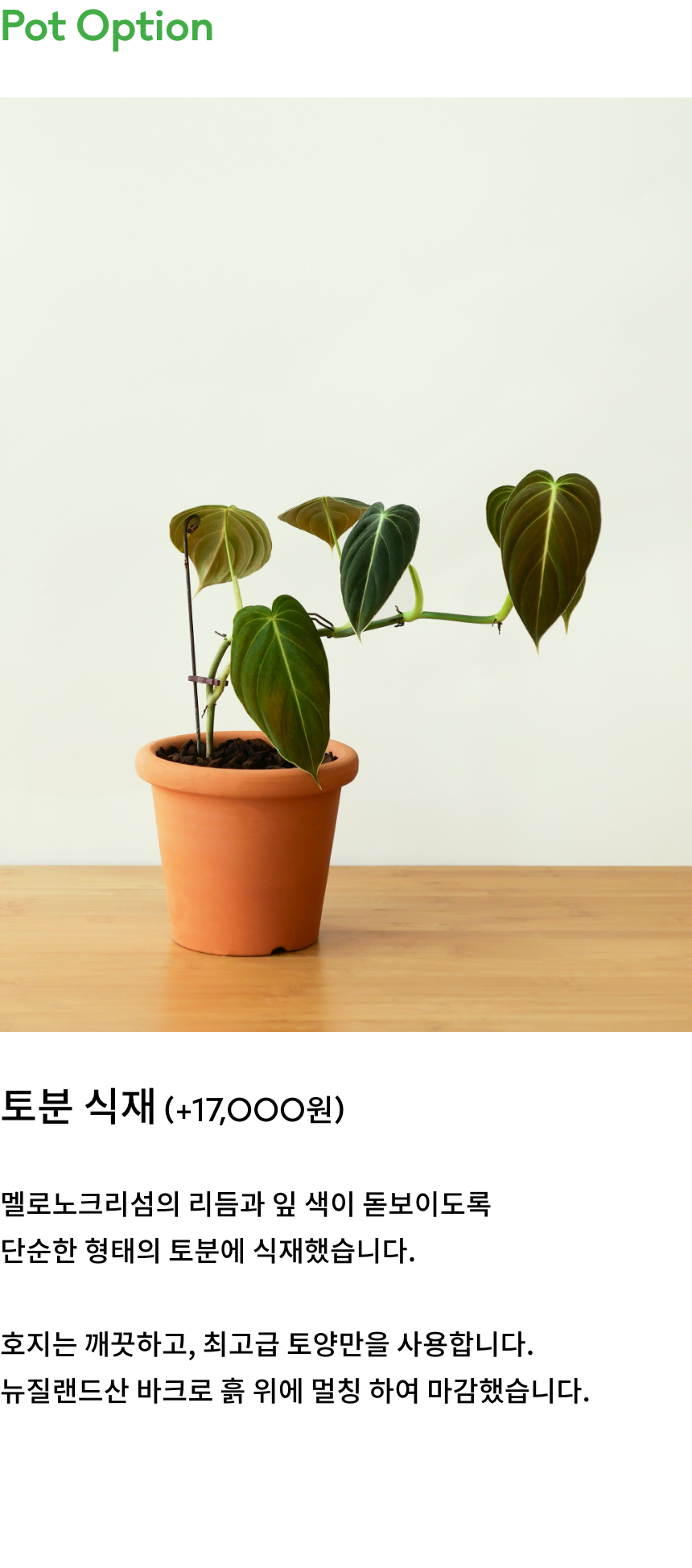 ◦ 식물 기본 팟 금액으로, 플라스틱 팟에 담겨 배송됩니다. 식재를 원한다면 ‘화분 옵션’에서 토분을 선택해 주세요.