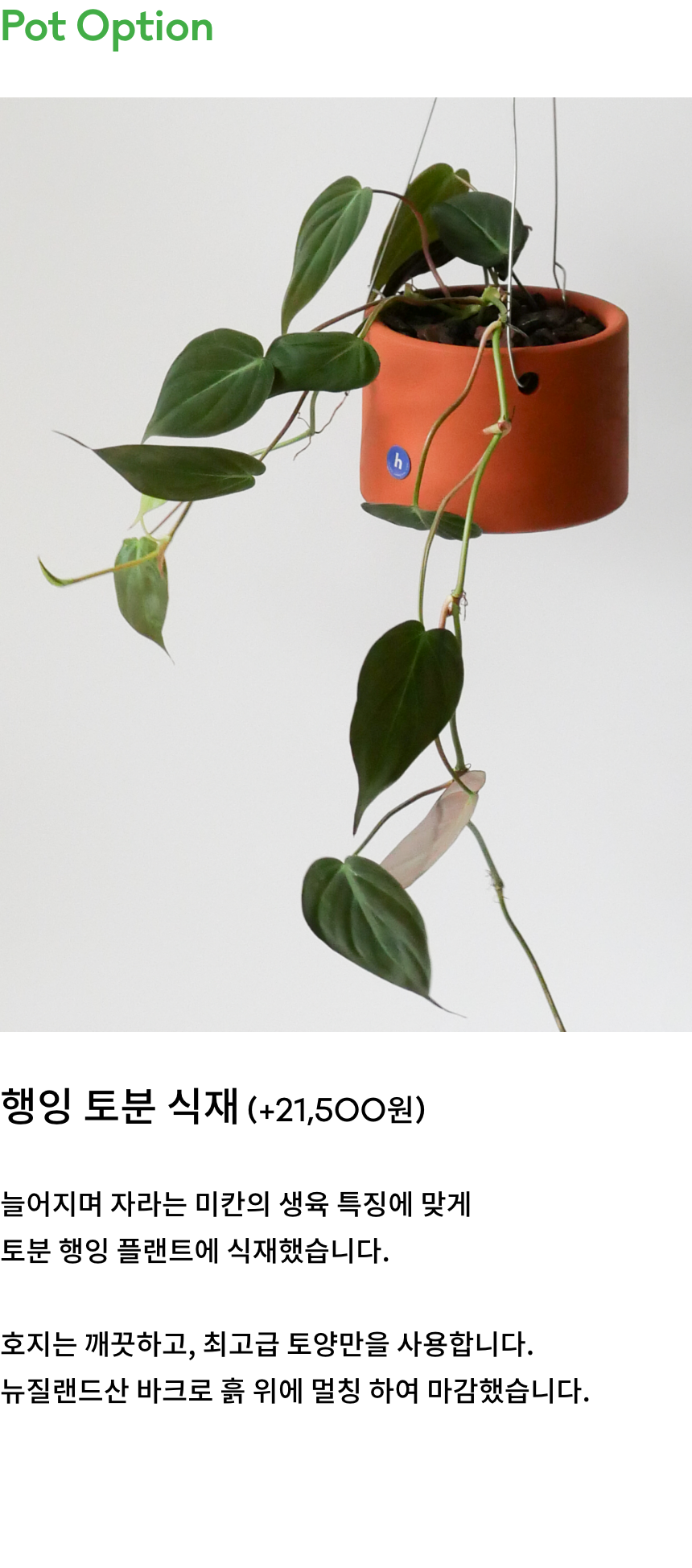 -모든 식물에게는 상처 등의 증상이 있을 수 있습니다. 잎이 시들고 새로운 잎을 내며 자라는 것은 식물에게 자연스러운 현상입니다. 이러한 이유로 교환 / 환불이 불가하기 때문에 이점 참고하시어 신중히 구매를 결정해주세요.