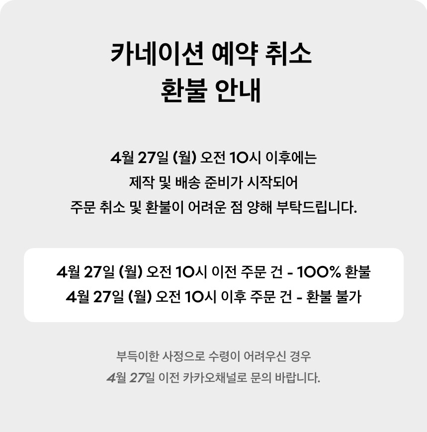 -상품 하자나 오배송의 경우, 수령일로부터 7일 이내에 카카오채널 고객센터 접수 후 교환·반품이 가능합니다. (교환/반품비 무료)