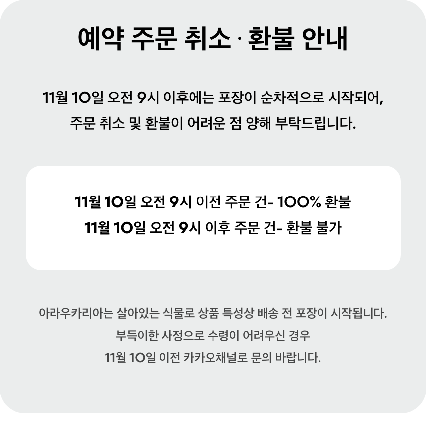 -모든 식물에게는 상처 등의 증상이 있을 수 있습니다. 잎이 시들고 새로운 잎을 내며 자라는 것은 식물에게 자연스러운 현상입니다. 이러한 이유로 교환 / 환불이 불가하기 때문에 이점 참고하시어 신중히 구매를 결정해주세요.